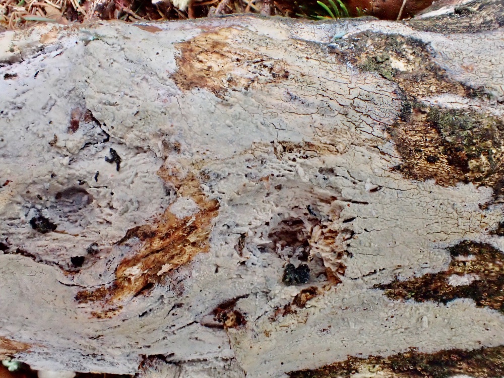 hier ist noch ein Rindenpilz den ich als Athelopsis lacerata (Amylocorticum laceratum) bestimmt habe. Zuerst war ich mir sehr sicher in der Bestimmung, wobei mir bei einer Nachrecherche dann doch auch noch recht unterschiedliche Informationen in den Literaturquellen aufgefallen sind, sodass eine Restunsicherheit bleibt, die dadurch verstärkt wird, dass ich die Gattung noch nie mikroskopiert habe.