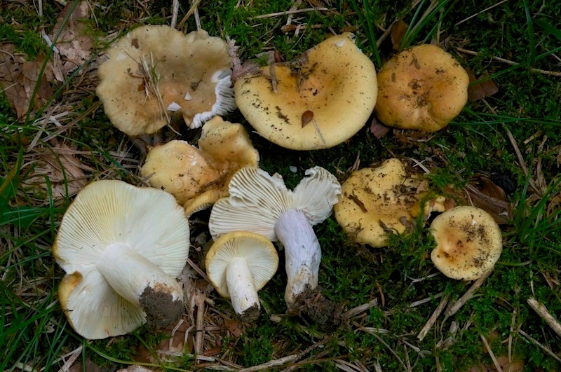 Russula ochroleuca (links) und Russula fellea (rechts)