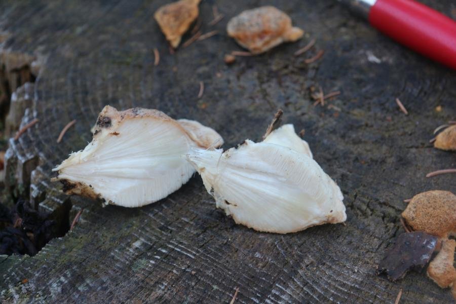 fein, dass hier schon viele Vorschläge stehen, und gut, dass du auch die Ökologie noch ergänzt hast. Bei mir war es auch schon ziemlich spät, als ich meinen Kommentar geschrieben habe, und dann fällt einem oft nicht mehr alles ein. Dem Vorschlag Hygrophorus lucorum für Nummer 2 schließe ich mich an, es sind ja auf dem Bild die Lärchennadeln dabei, die hatte ich in der Eile zuerst übersehen. Auch 5-6 könnte durchaus Gymnopilus penetrans sein. Schau mal, ob er im Mikroskop raue Sporen und leicht kopfige Cheilocystiden hat. Inzwischen hast Du mir auch geschrieben, dass du die Porlingsfruchtkörper von jung bis alt auf ein- und demselben Baumstamm beobachtet hast. Damit ist die Sache klar, die Fotos 11-15 sind alte Climacocystis borealis. Trametopsis cervina streichen. Insgesamt eine gute Dokumentation der Entwicklung. Und wieder mal ein Beispiel dafür, dass man bei Pilzen alle Entwicklungsstadien vergleichend beisammen haben sollte. Das Porenbild beider Arten ist recht ähnlich, man kann da schon mal alte, bereits in der Farbe untypische C. borealis mit jungen Trametopsis cervina verwechseln. Das Foto des durchgeschnittenen Fruchtkörpers zeigt auch eindeutig den Nördlichen Schwammporling mit weißlicher Trama. Trametopsis cervina hätte eine zimbräunliche Trama.