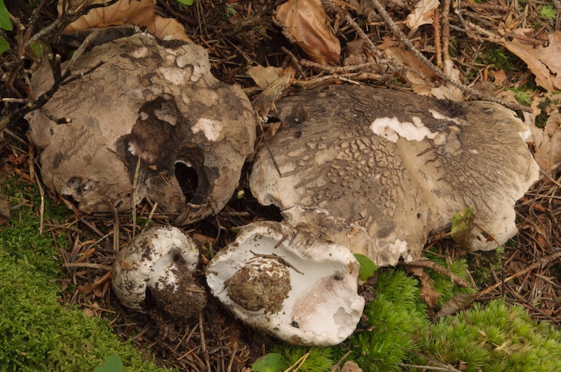 3. Bei Pinus, aber auch Picea, Abies, Larix oder in Mischwäldern; Hut hellgrau; KOH hellgrün auf frischem Material (schwarz im trockenen Zustand) auf allen Teilen des Fruchtkörpers..................................................................... Boletopsis grisea (Peck) Bondartsev & Sänger