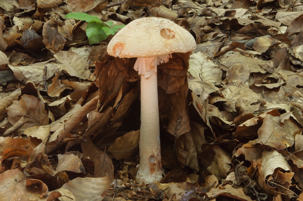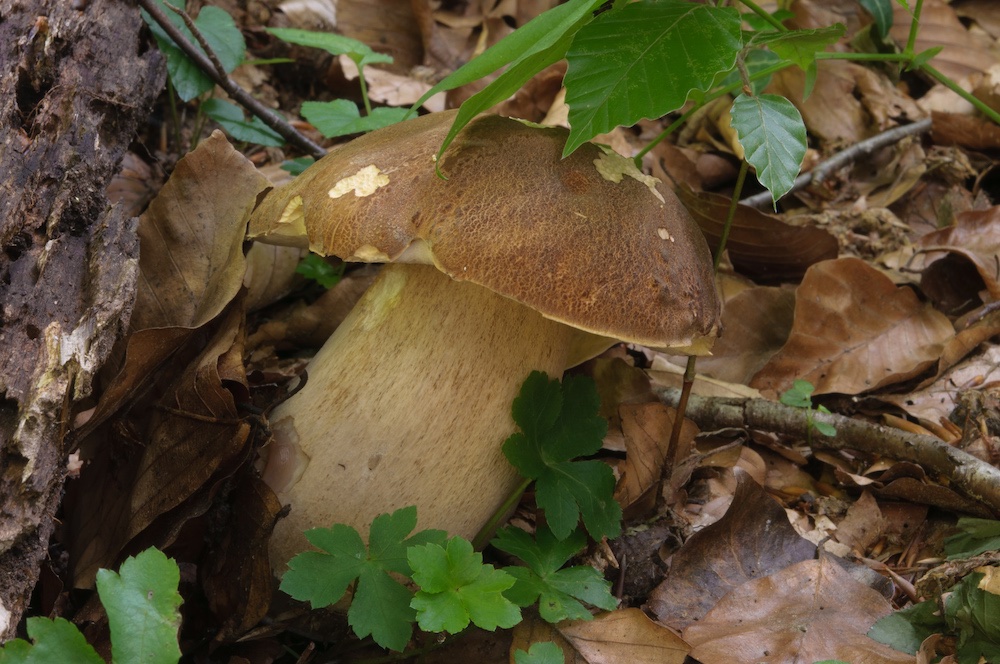 Xerocomellus porosporus/truncatus: Ein Filzröhrling mit abgestutzten Sporen unter älteren Buchen. Mit Wolfgangs Schlüssel komme ich zu diesen beiden Arten – ob die Sporen längsgerippt sind, kann ich im LM nicht sicher erkennen, ich werde aber versuchen, das im REM überprüfen zu lassen. Für X. porosporus irritiert mich das blauende Fleisch etwas, X. truncatus kenne ich nicht.