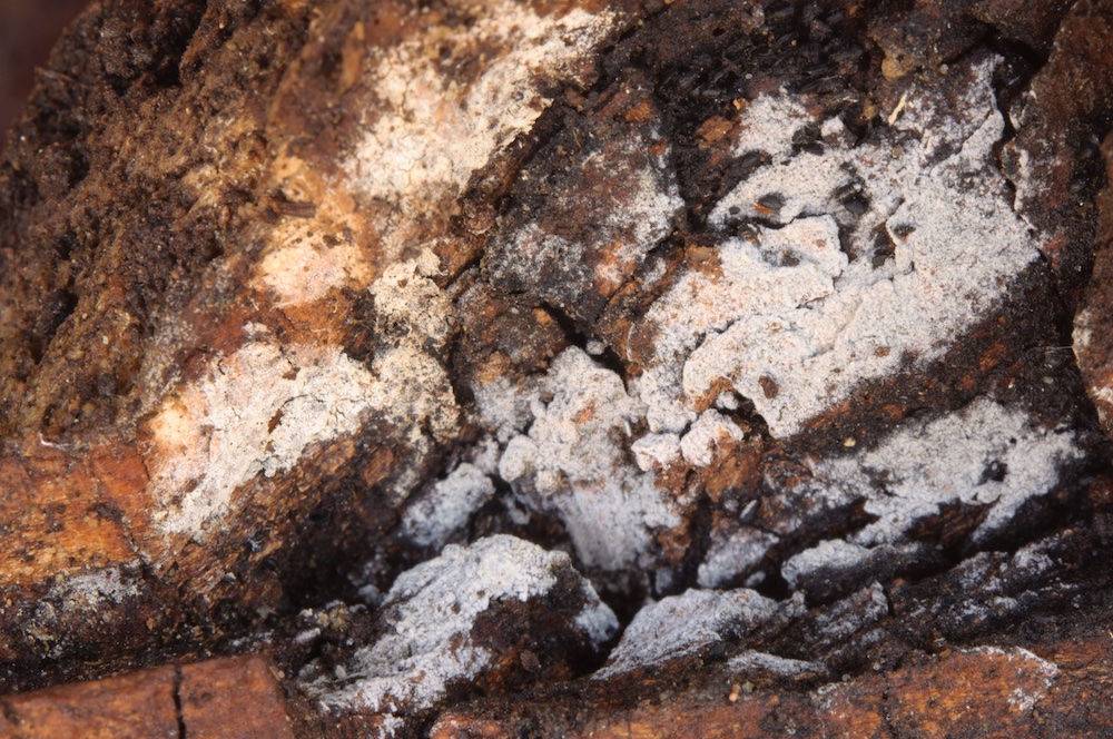 Botryobasidium aureum: Viel auffälliger als die Hauptfruchtform (hier in der Mitte) ist das pulvrige, gelbliche asexuelle Stadium. Da die HFF auch noch unreif war, gelang die Bestimmung nur über die großen (> 20 µm langen), zitronenförmigen Konidien. Liegender Salix-Stamm.