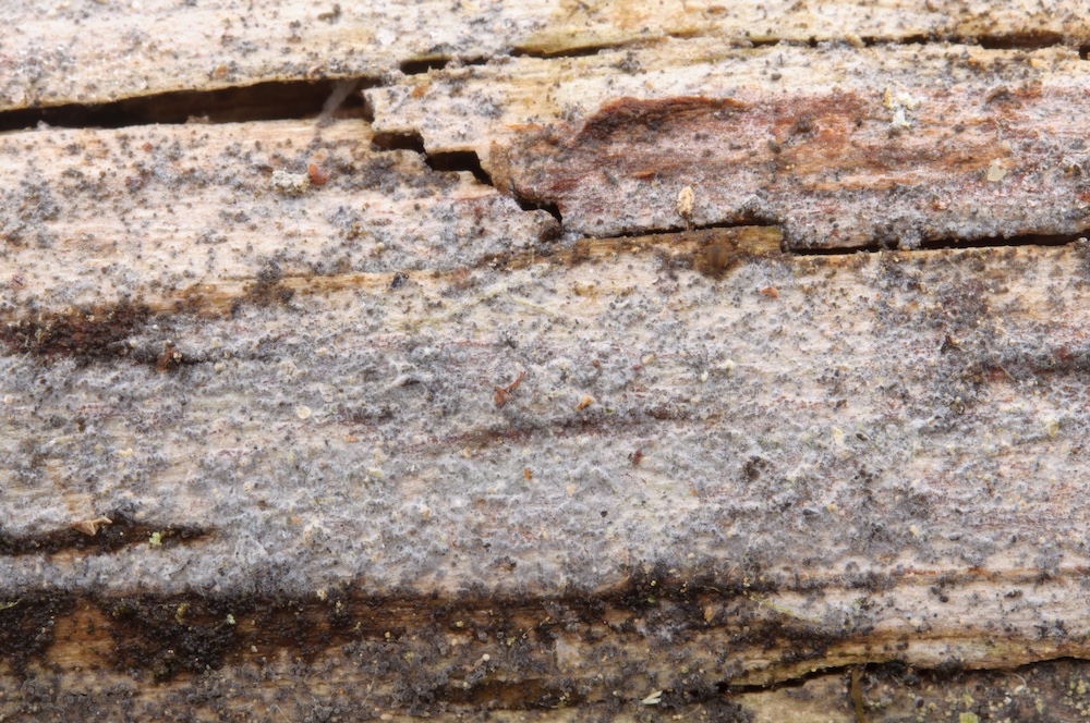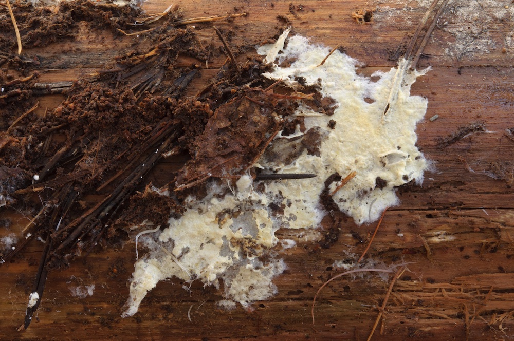 Coniophora puteana: Eine häufige Art, die man auf Laub- und Nadelholz antreffen kann. Hier auf einem entwurzelten Fagus-Stamm.