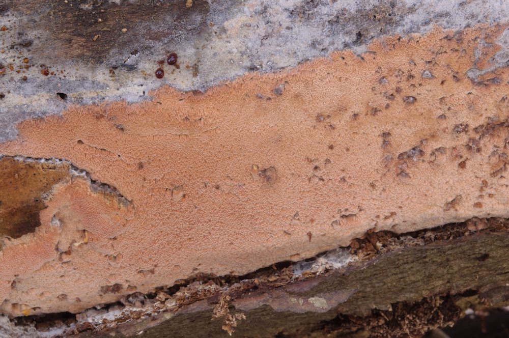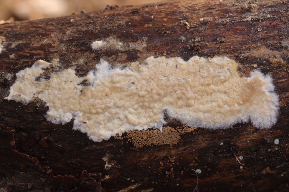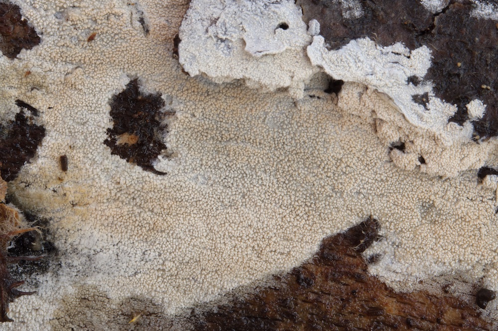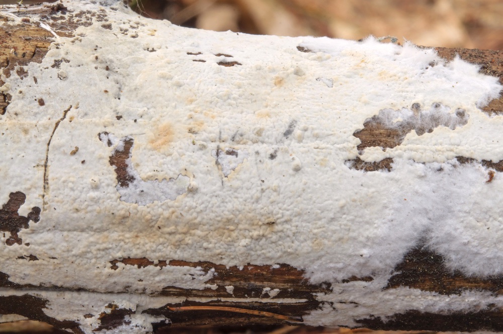 Peniophorella praetermissa agg.: Einer der häufigsten ± flaumigen, weißen Rindenpilze und einen mikroskopisch sehr variablen Artenkomplex darstellend. Entrindeter Nadelholz-Ast.