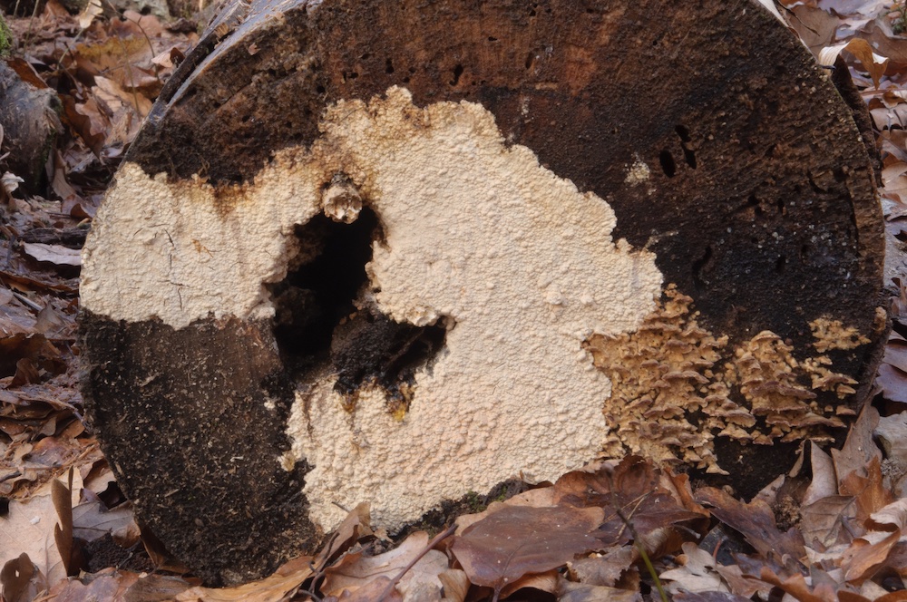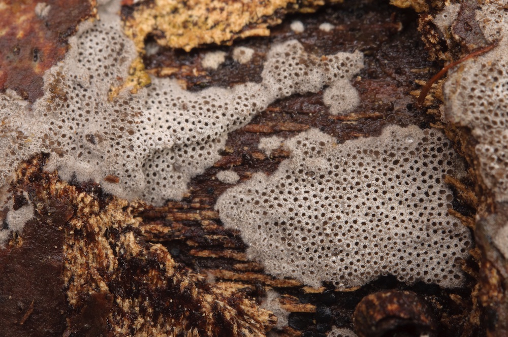 Irpex lacteus: Durch die unregelmäßig labyrinthischen bis zähnchenförmigen Poren und die hellen, resupinaten oder kleine Hütchen bildenden Fruchtkörper schon makroskopisch ganz gut festgelegt. Laubholz-Ast, ca. 1 m über dem Boden. .