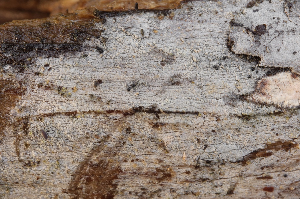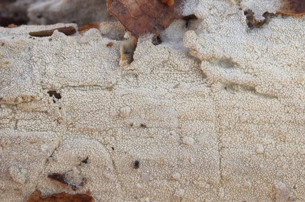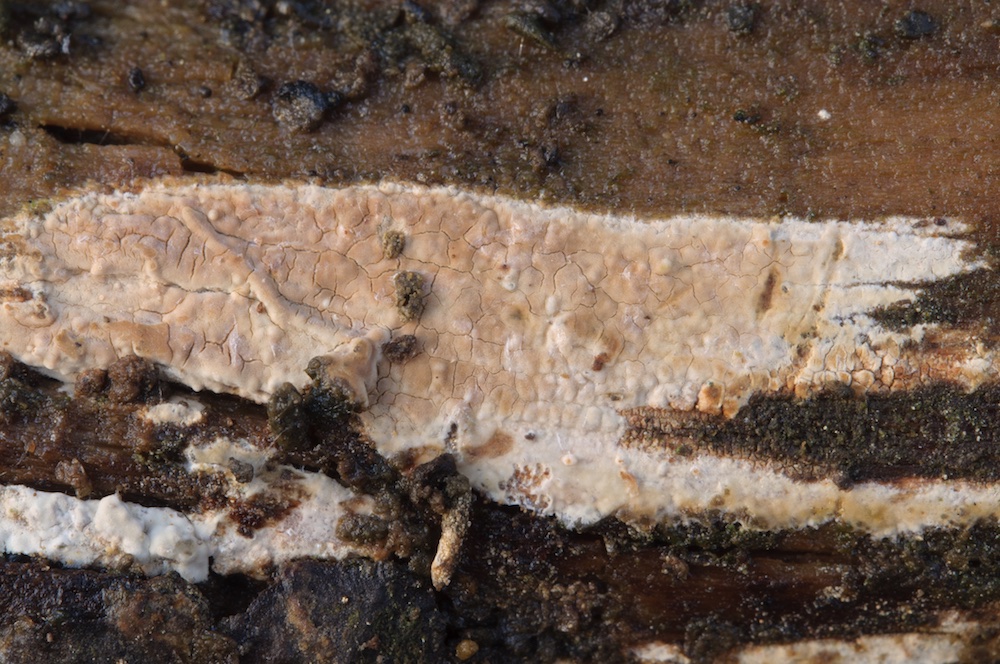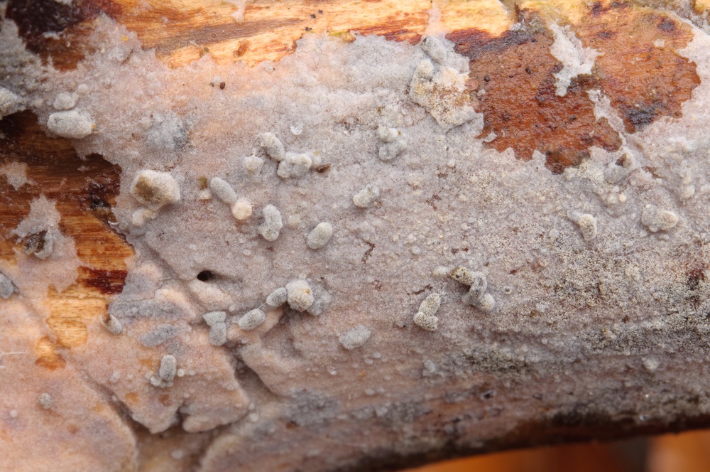 Cylindrobasidium laeve: Sehr häufiger Pilz, in diesem Fall aber erst mikroskopisch erkannt. Liegender Fagus-Ast.