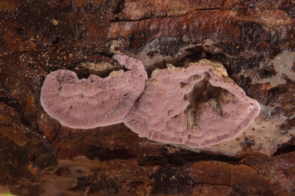 Phlebia lilascens: Unterscheidet sich von der folgenden Art insbesondere durch die Sporenform, wohingegen das Vorhandensein von Zystiden recht variabel ist (bei P. lilascens sollen diese fehlen). Liegender Pinus-sylvestris-Ast.