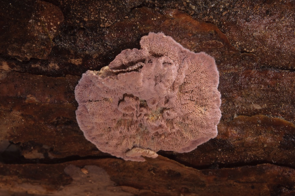 Phlebia queletii: Nun wieder ein besonderer Fund, ohne Eintragungen in der Mykologischen Datenbank. Laut Literatur wächst sie bevorzugt auf Weißtanne, so wie hier (liegender Ast). Die kleinen Stacheln setzen sich aus zugespitzten Lamprozystiden zusammen, sind also im Mikroskop recht hübsch anzuschauen.