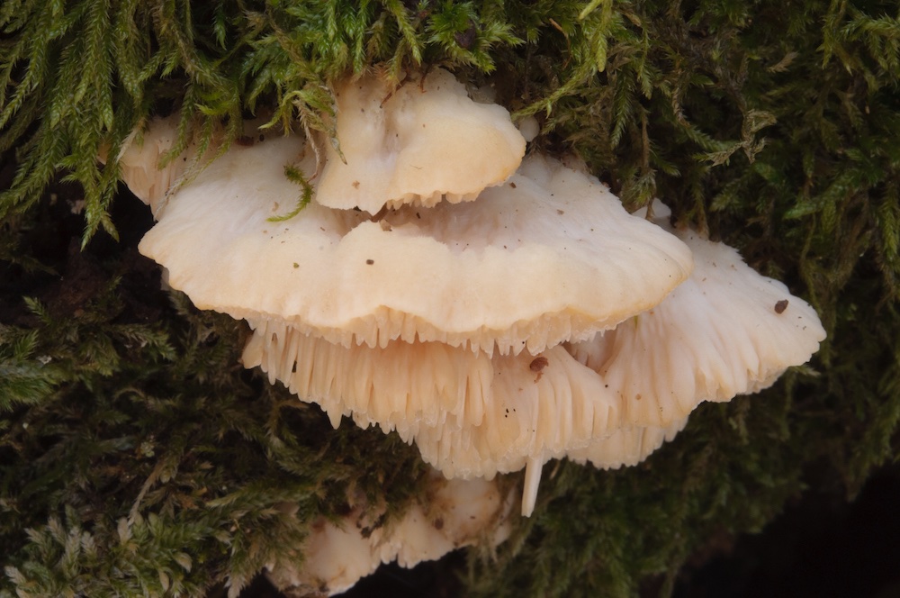 Crepidotus epibryus: Unterseite eines liegenden, entrindeten Laubholz-Stammes. Als weißes Stummelfüßchen nur mikroskopisch sicher bestimmbar, jedoch sind die hellen Lamellen und die späte Erscheinungszeit schon Hinweise für C. epibryus. .