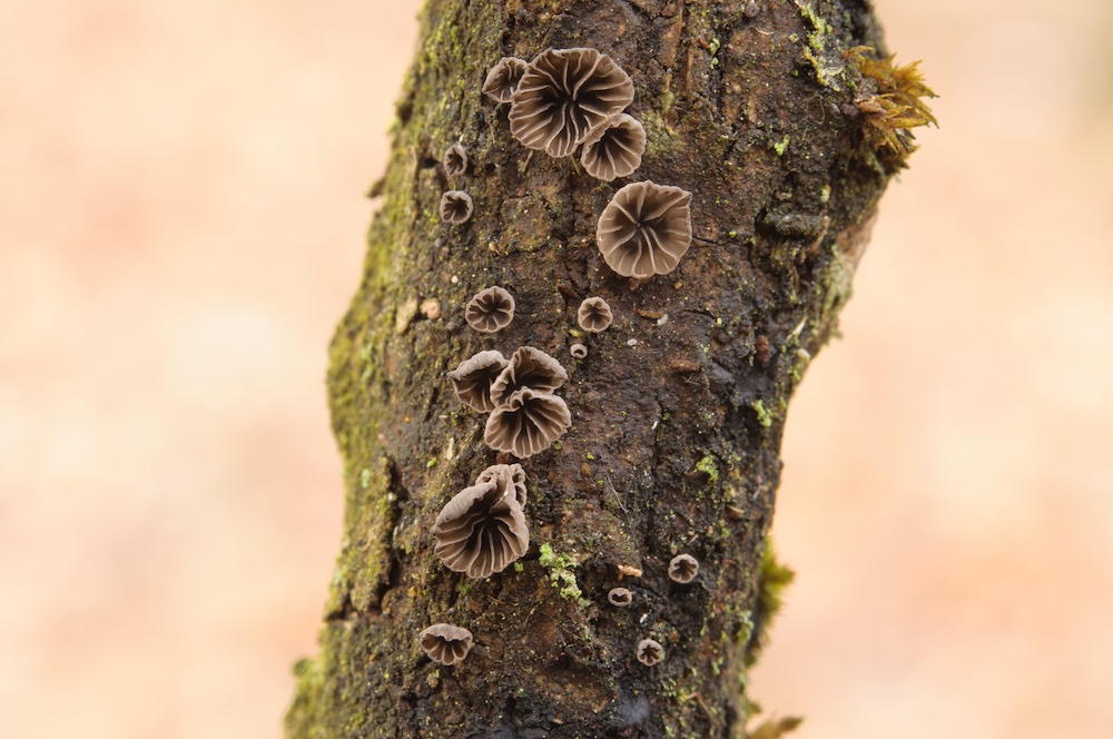Resupinatus conspersus: Ein typischer Tannenbewohner, der sich schon im Luftraum entwickelt und meist erst dann gefunden werden kann, wenn die Äste zu Boden fallen. .