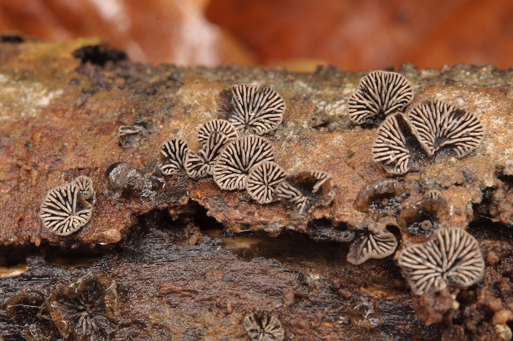 Resupinatus trichotis: Häufiger Pilz mit schwarzer, scharf abgegrenzter, filzig-haariger Anwachsstelle und dunklen Lamellen mit helleren Schneiden. Liegender Laubholz-Ast. .