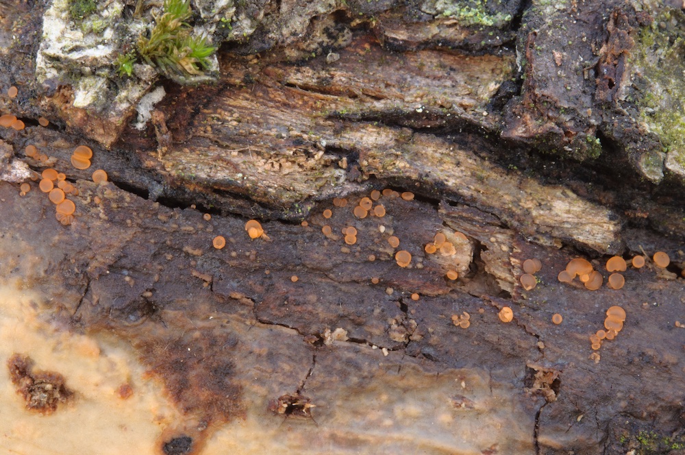 #2Dacrymyces tortus: Klein, unscheinbar und auch kaum gallertig, dennoch eine Gallertträne. Liegender Pinus-Ast.