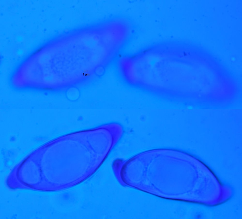 Gemessen habe ich 30 Sporen in Wasser. Das Ornament war deutlich zu erkennen, in Wasser eigentlich besser als in Baumwollblau. Man kann es gut in der Abbildung sehen. Was ich bisher nicht hatte: man kann bei sehr wenigen Sporen sogar im Profil das Ornament erkennen (rote Pfeile im Bild). Das bewegt sich aber an der Auflösungsgrenze.