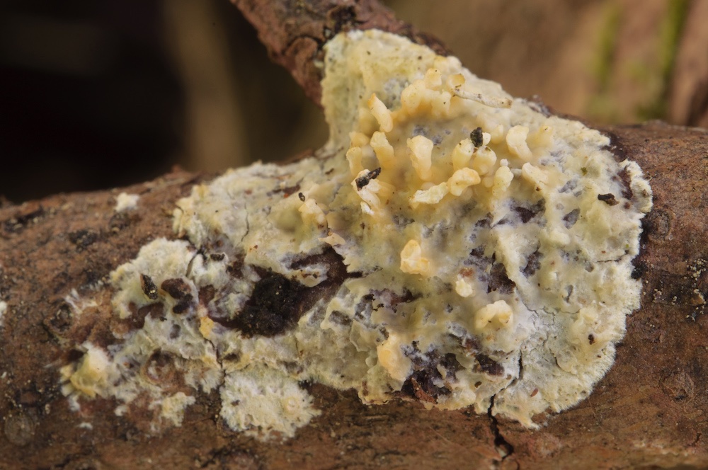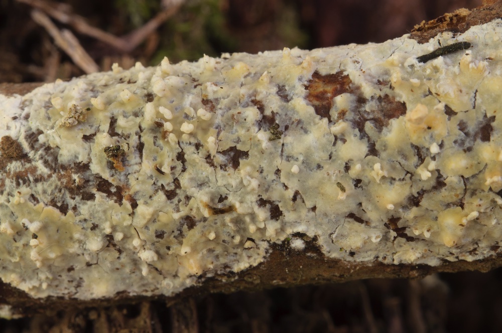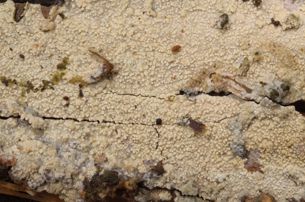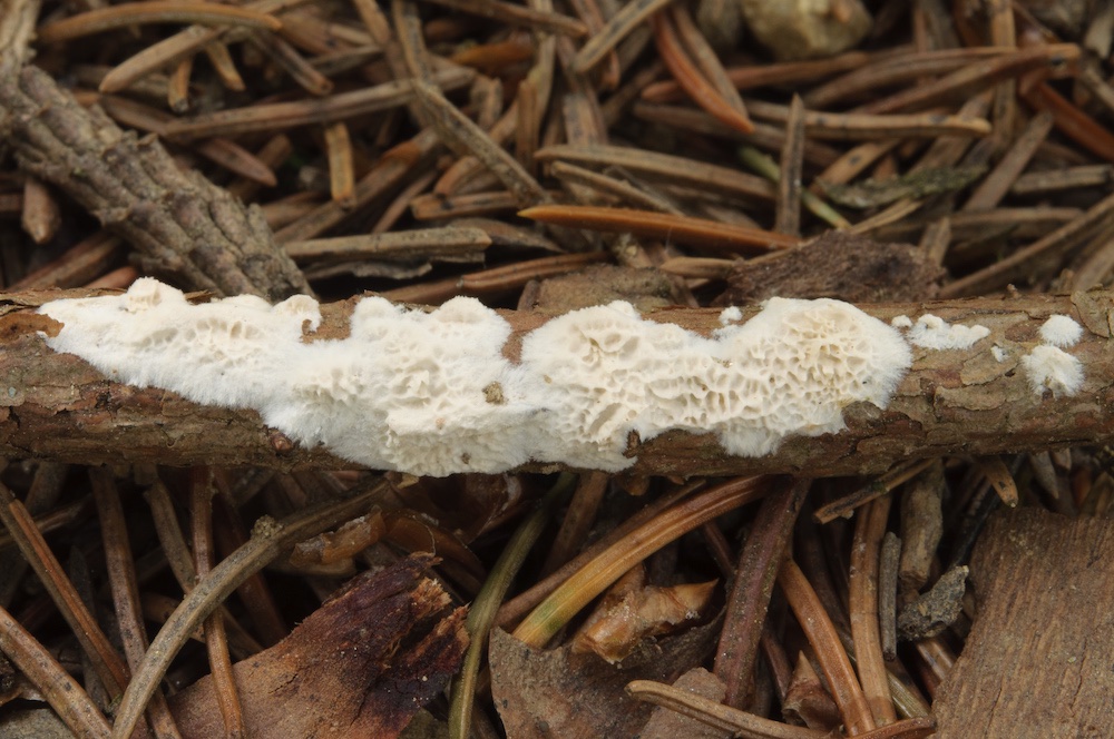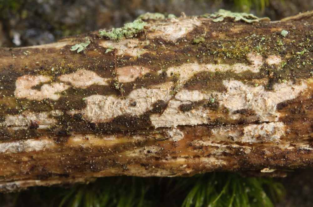 Peniophorella pallida: Nadelholz-Ast (vermutlich Pinus).