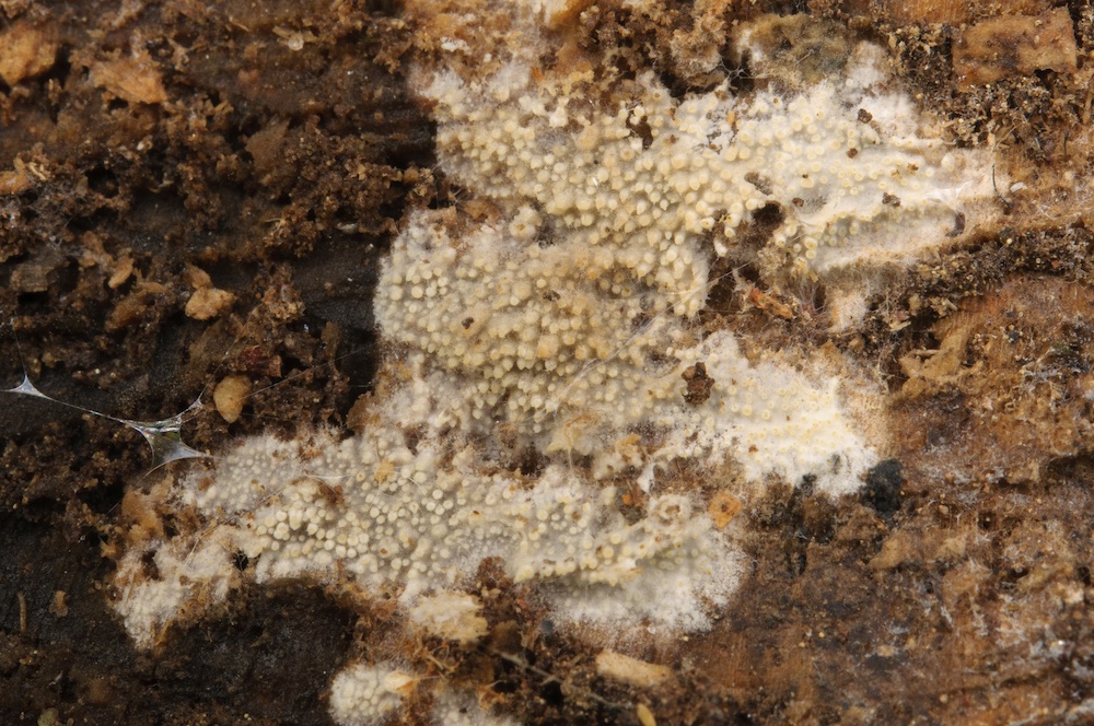 Dacryobolus sudans: Unterseite einer Nadelholz-Baumscheibe.