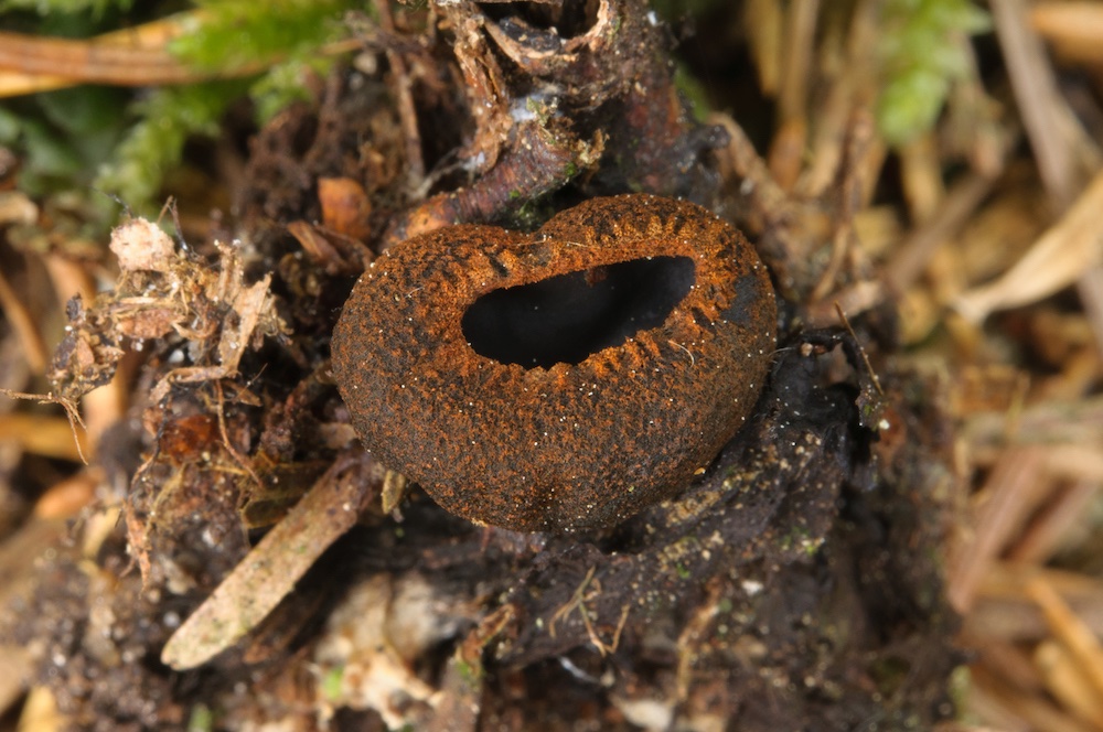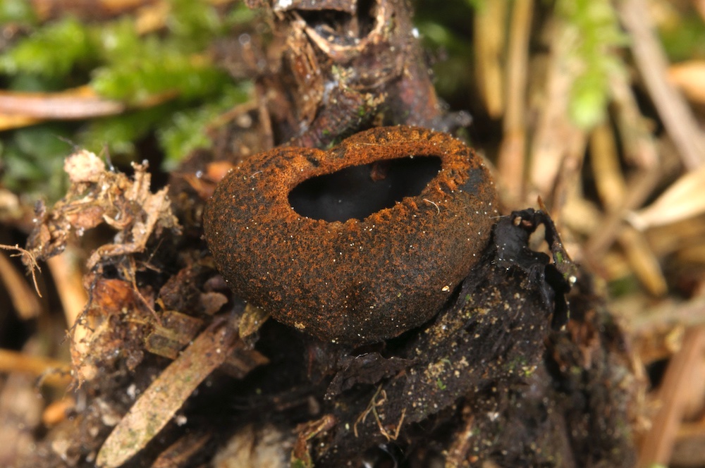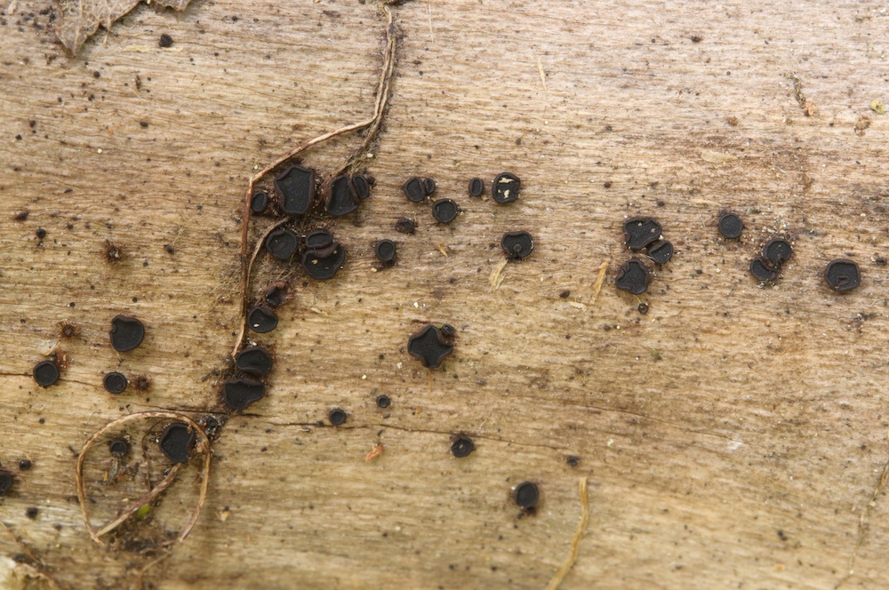 Plectania melastoma: Hat mich besonders gefreut. Auf vergrabenem, dünnem Laubholz-Ast.