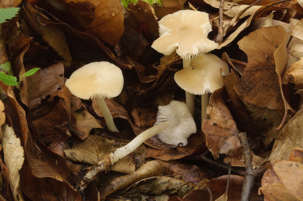 Entoloma pseudosericeoides: Übergang zwischen Rasen und Buchenstreu.
