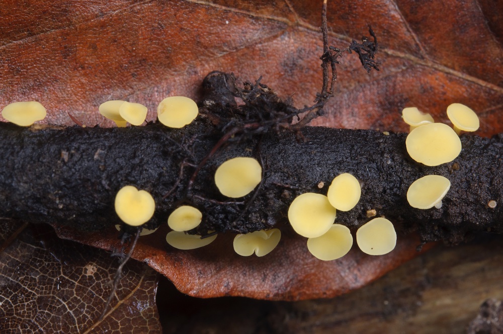 Hymenoscyphus serotinus: Häufiger Becherling im Herbst auf Fagus-Ästen, mikroskopisch leicht anhand der gekrümmten Sporen zu erkennen.