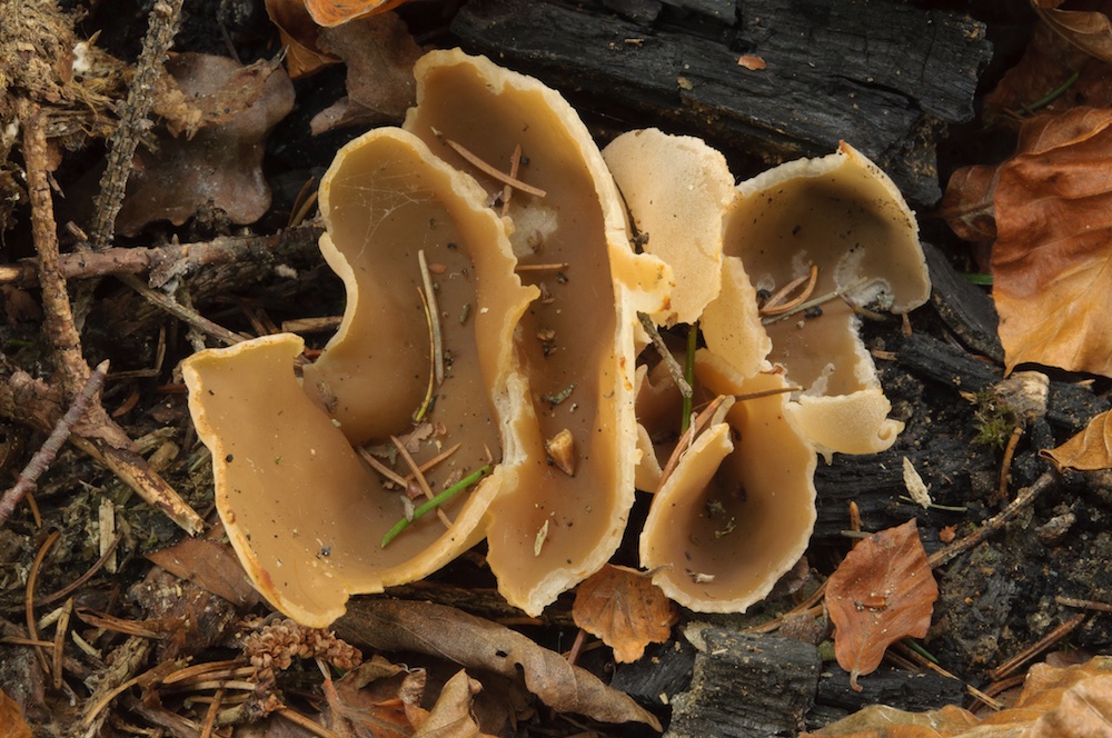 Peziza repanda: So würde die Bestimmung mit dem Hohmeyer-Schlüssel lauten. Alternativ Peziza varia s. l. Verkohltes Holzstück von Brandstelle.