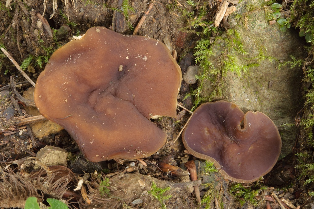 Peziza retrocurvata: Auf Erde bzw. auf/nahe Fagus-Strunk. Eine der wenigen Peziza-Arten mit multiguttulaten Sporen. Die Abgrenzung von P. retrocurvatoides ist schwierig...
