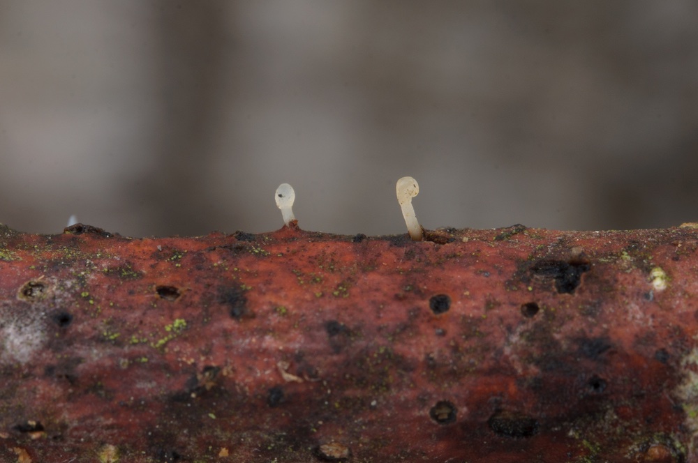Ascocoryne solitaria: Auffällig die gestielt-kopfige Nebenfruchtform. Laubholzstamm.