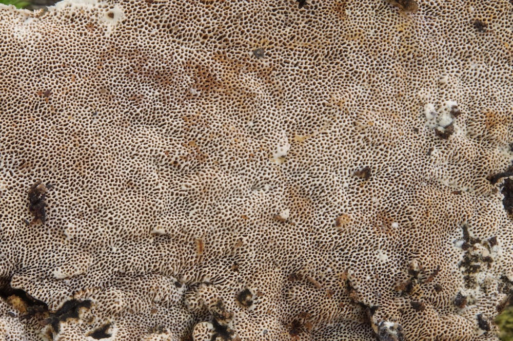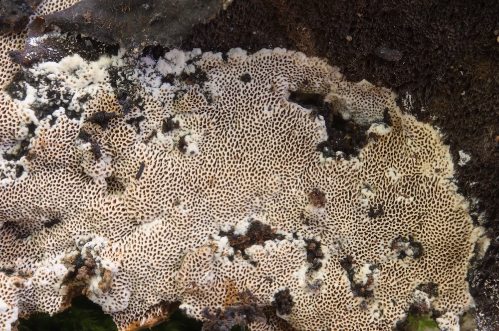 Aporpium canescens: Ein Heterobasidiomycet mit Poren! Allein aus diesem Grund schon ein besonders interessanter Pilz. Liegender Fagus-Stamm.