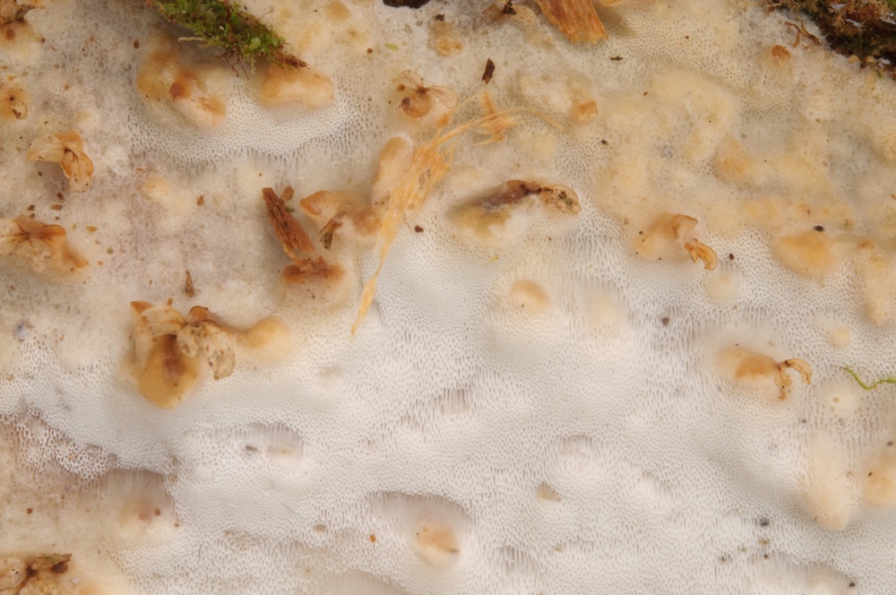 Flaviporus citrinellus (= Antrodiella citrinella): Ein charakteristischer Urwaldpilz, der an von Fomitopsis pinicola befallenen Nadelholzstämmen wächst (hier Picea).