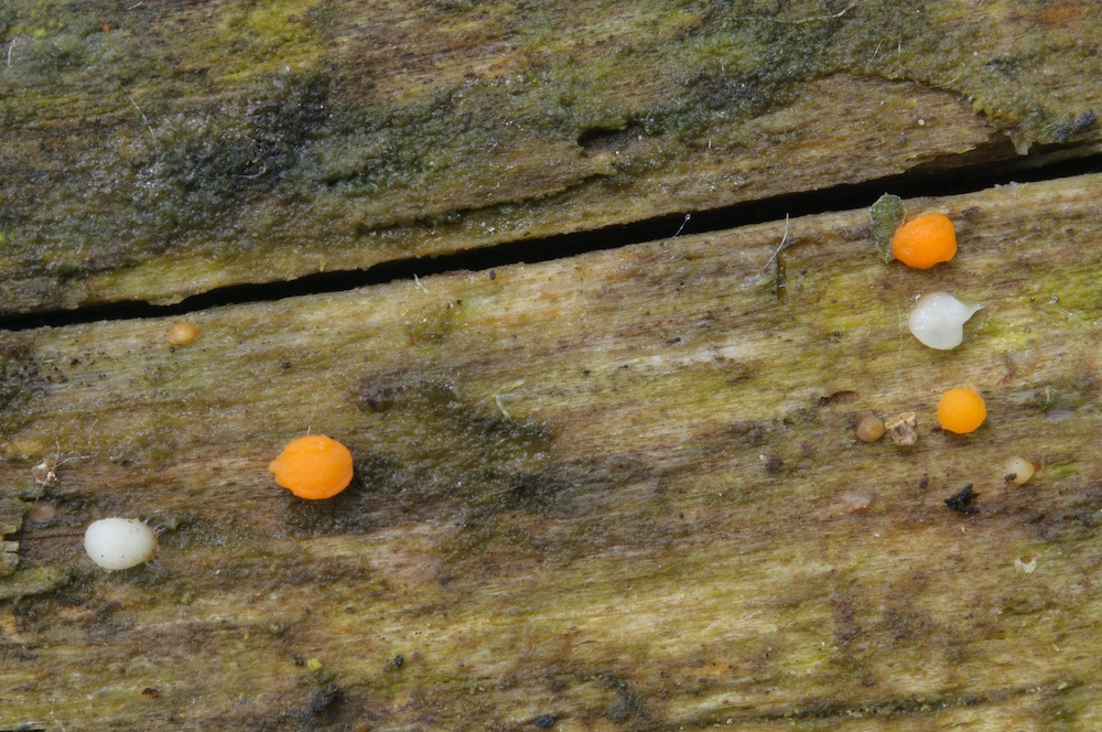 Scutellinia setosa: Morscher Baumstamm. Ein seltener Schildborstling mit eher blassen bis gelblichen Apothecien und im Lichtmikroskop glatten Sporen.