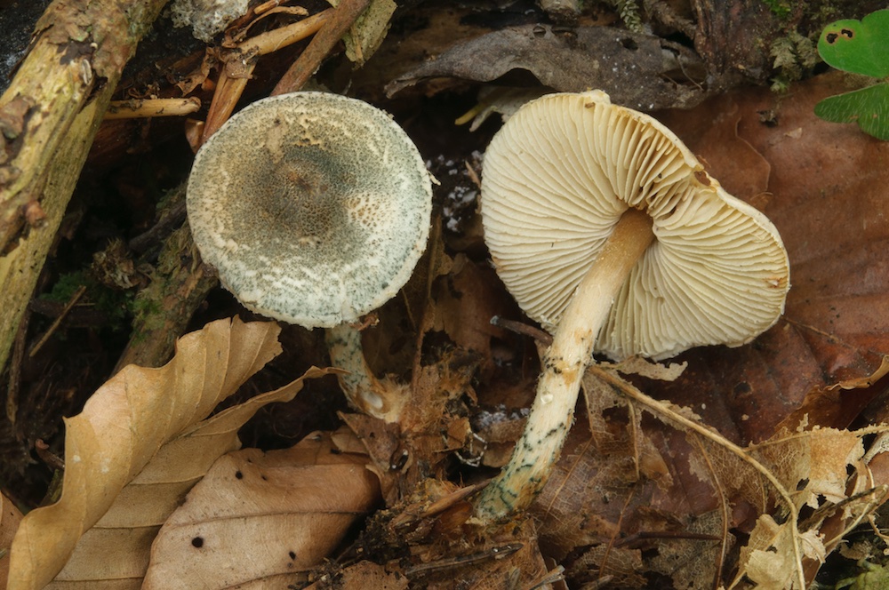Stropharia aeruginosa (links) und Stropharia caerulea (Mitte + rechts)