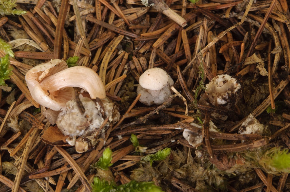 Mucronella calva s. l.: Unterseite von Fomitopsis pinicola.