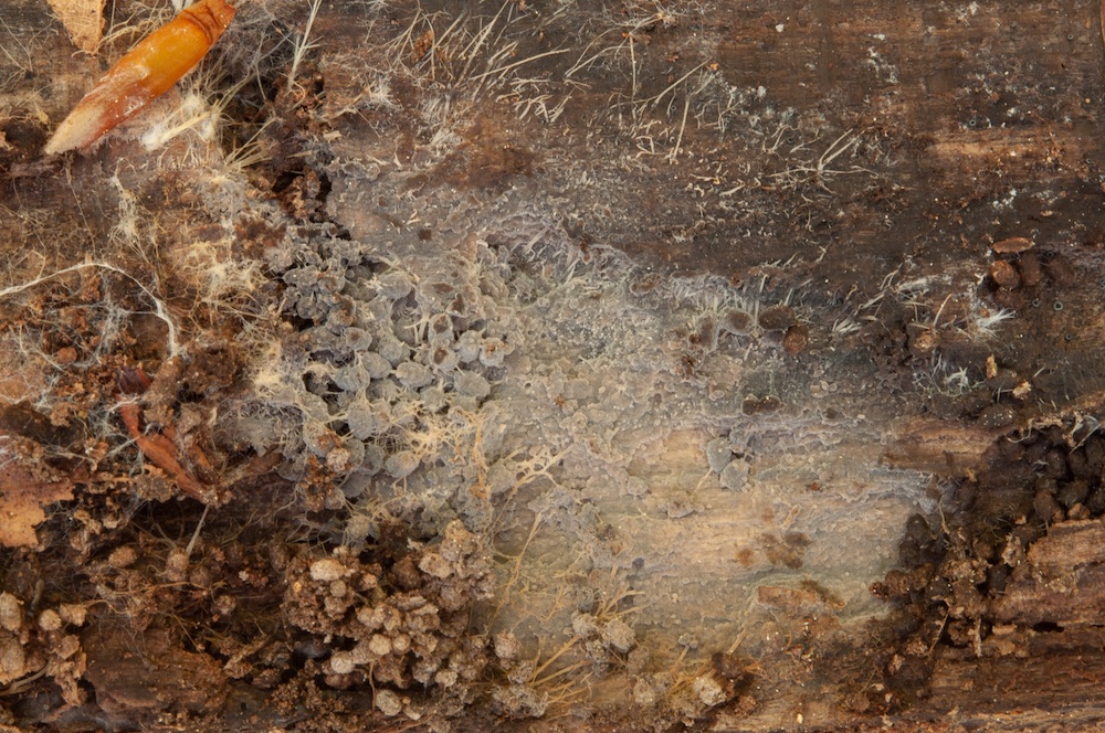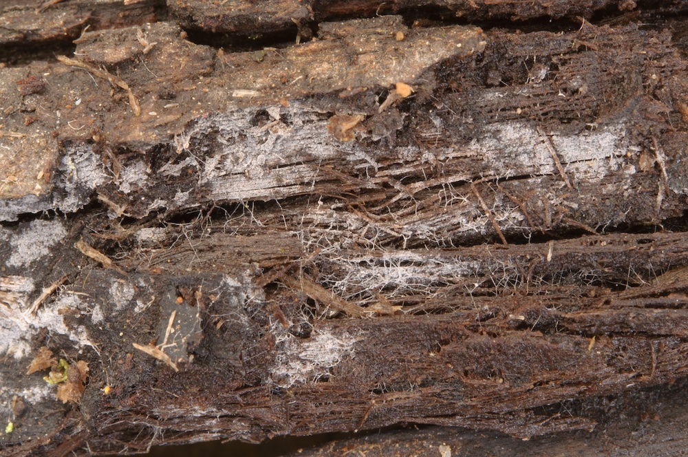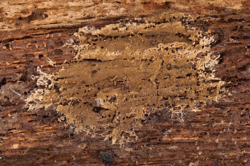 Coniophora olivacea: Liegender Pinus-sylvestris-Ast.