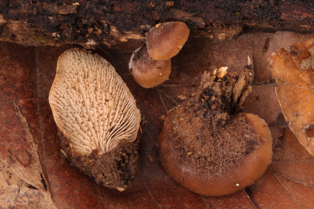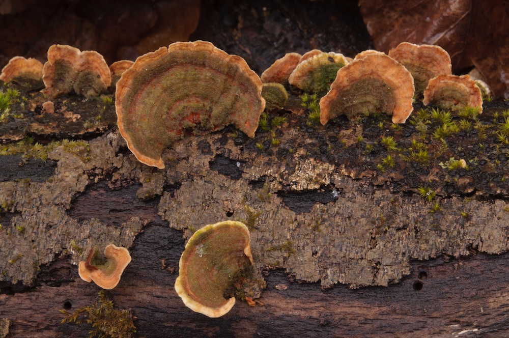 Stereum gausapatum: Liegender Quercus-Stamm. Wuchs zusammen mit den folgenden beiden Schichtpilzen, und S. hirsutum, auf einer Fläche von wenigen Quadratmetern.