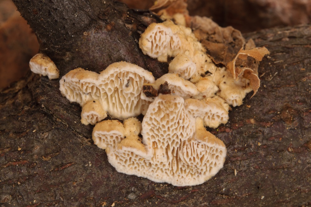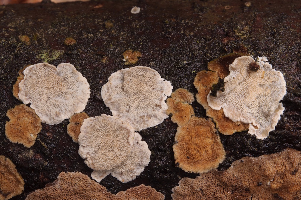Skeletocutis carneogrisea: Liegender Abies-Ast, mit Trichaptum abietinum.