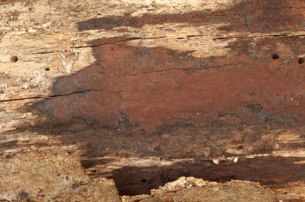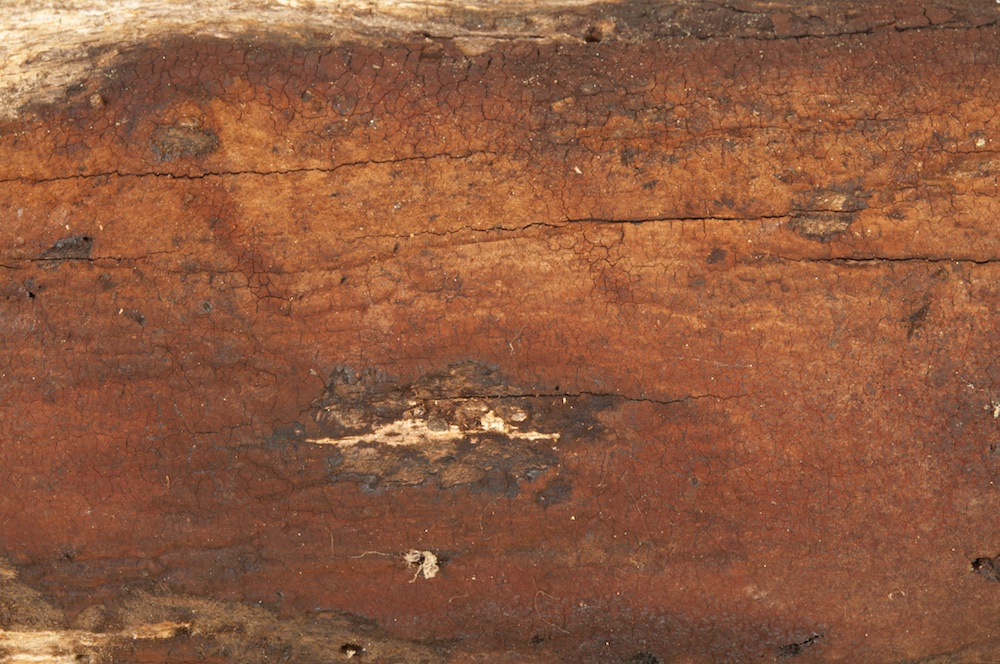 Stereum insignitum: Liegender Fagus-Ast (oben) und liegender Quercus-Stamm (unten).
