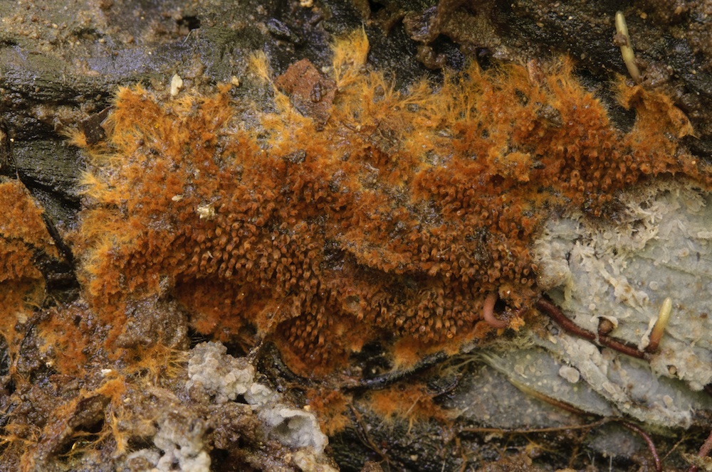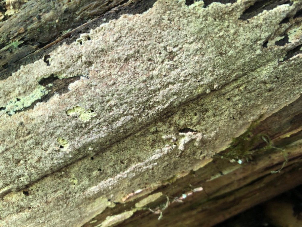 Tomentella crinalis: Stark vermorschtes, neben einem Bach liegendes Holzstück. Auf dem Foto ist ebenfalls Xenasma pruinosum zu sehen.