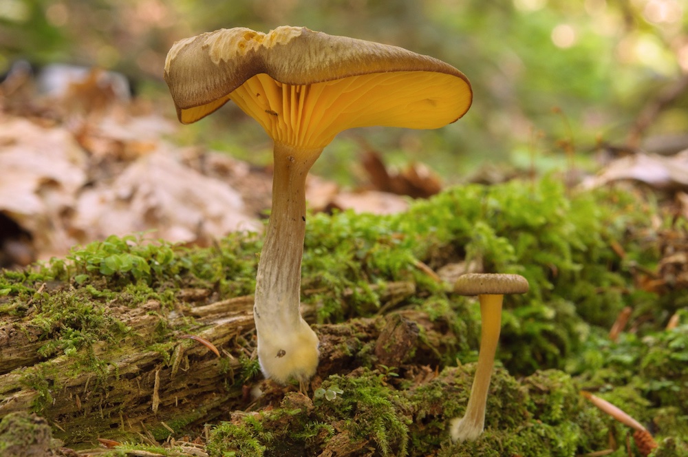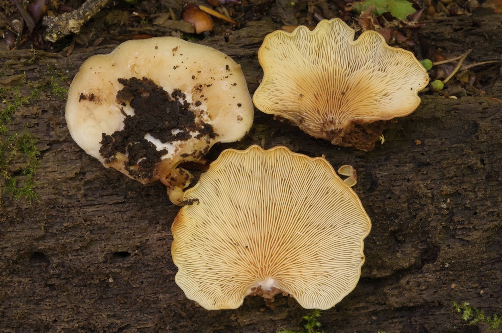 Chrysomphalina chrysophylla: Stark vermorschtes Nadelholz-Stammstück.