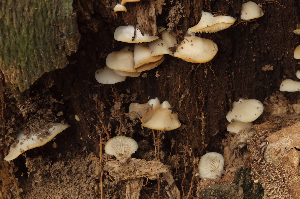 Coprinopsis laanii: Schnittfläche eines liegenden Abies-Stammes.