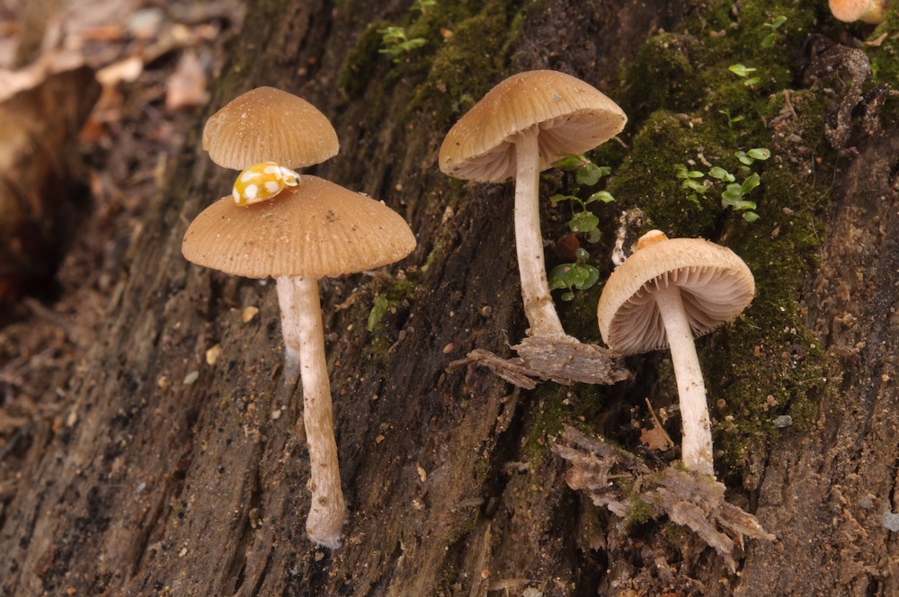 Psathyrella obtusata: Feuchtes, morsches Laubholzstück. Mit tierischem Bewacher.