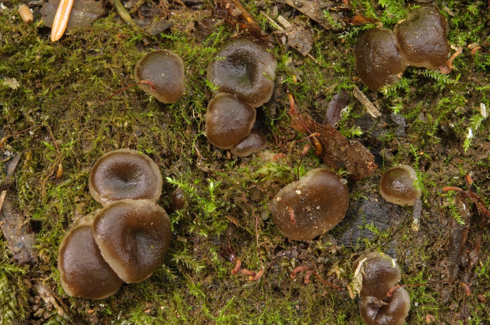 Psilopezia nummularia: Auf feucht liegendem Laubholz (unten: aus Oberösterreich).