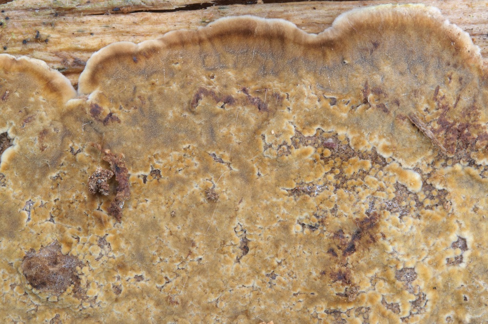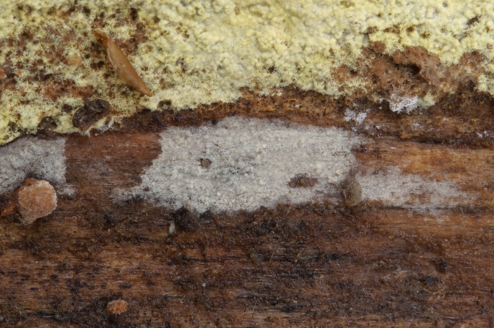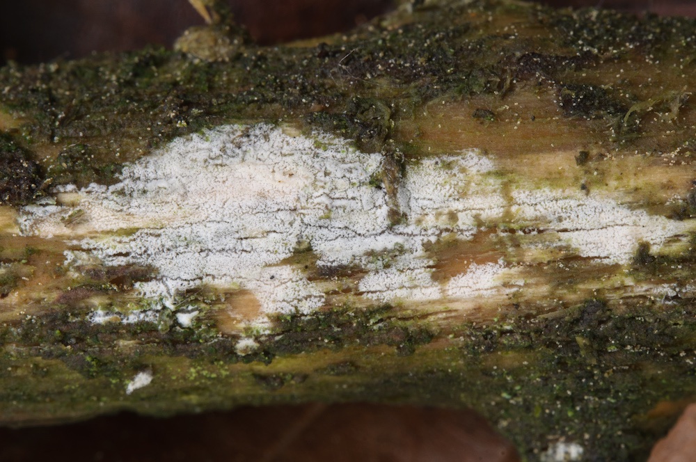 Basidiodendron grandinioides: Liegender Picea-Stamm. Durch die sehr kleinen, kugeligen Sporen und das Vorkommen auf Nadelholz gut gekennzeichnet.