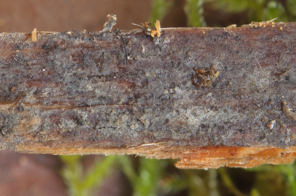 Repetobasidium vestitum: Liegender Picea-Stamm. Kaum sichtbarer Rindenpilz, von dem es bislang laut Mykol. DB erst einen österreichischen Fund gab.