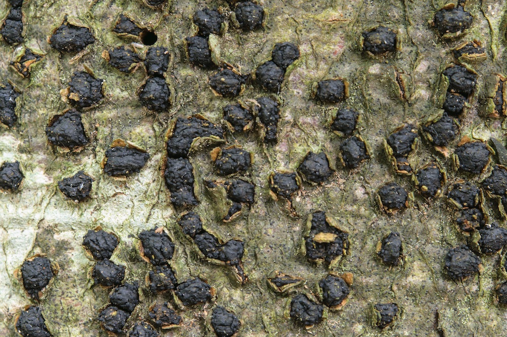 Melogramma spiniferum: Basis eines Fagus-Stamms. .