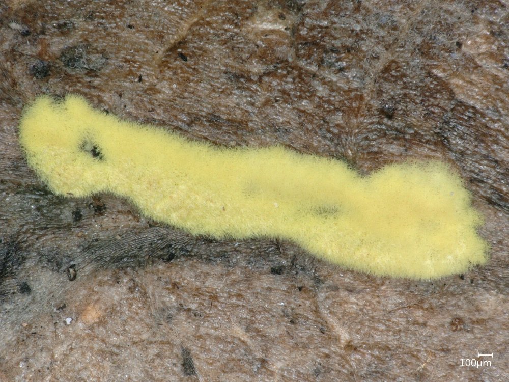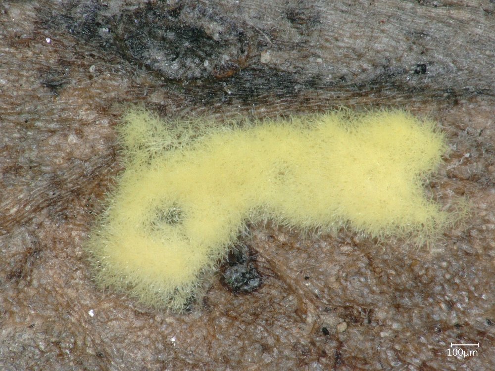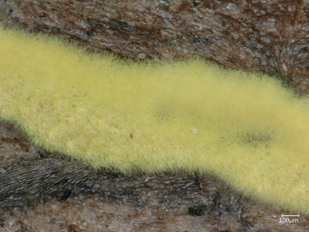 einen interessanten gerade noch Oktoberfund (vom 29.), den Gabi Hekerle während meiner Zoo-Bot/Naturschutzbund/ÖMG-Exkursion gesammelt hat, möchte ich euch zeigen: Cylindrium aeruginosum. Ein anamorphes Stadium, leuchtend zitronengelb und pelzig-wuschelig auf z.B. Eichenblättern am Boden. Die Konidien sind schmale zylindrische Stäbchen.
