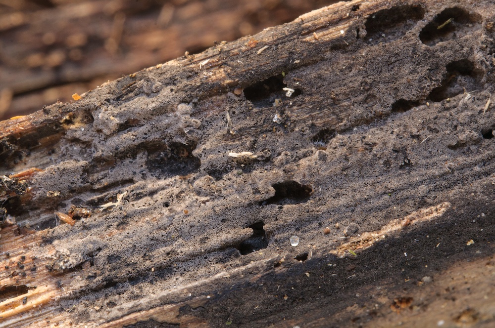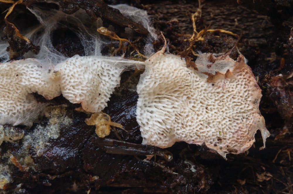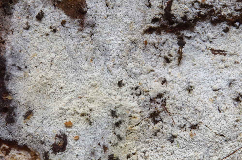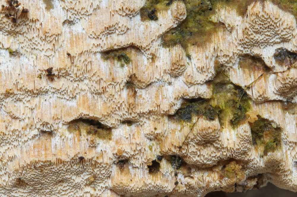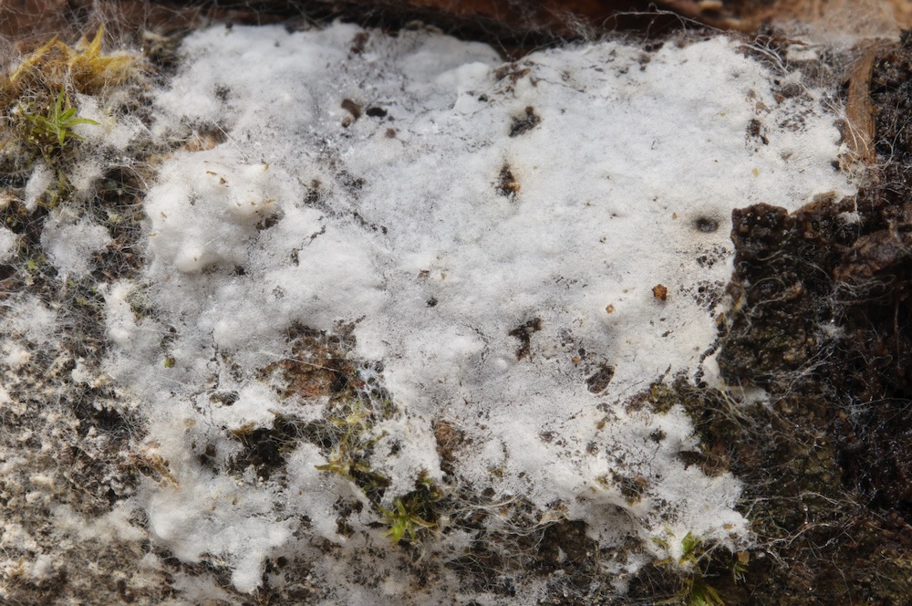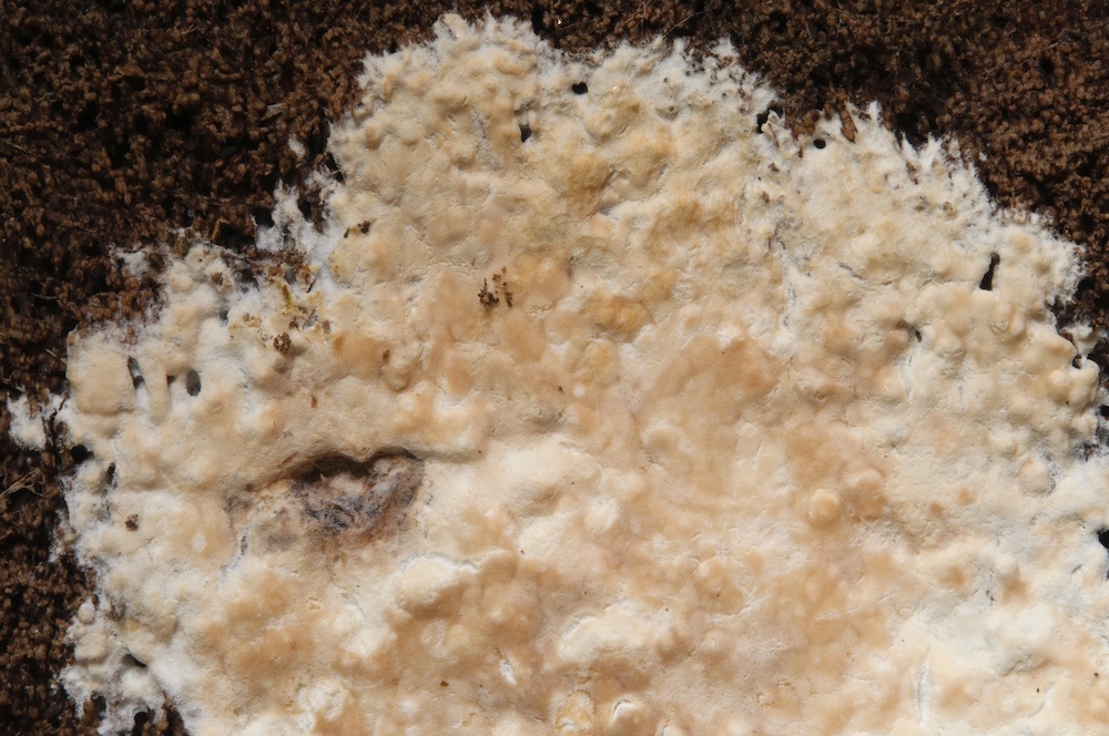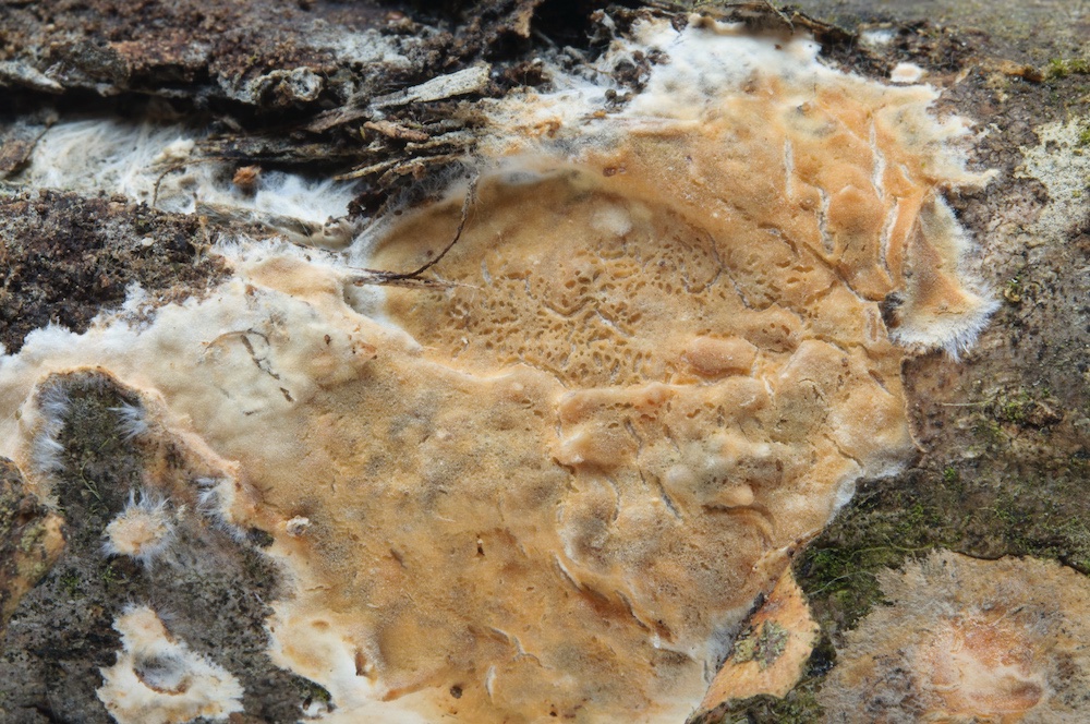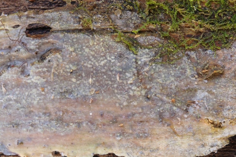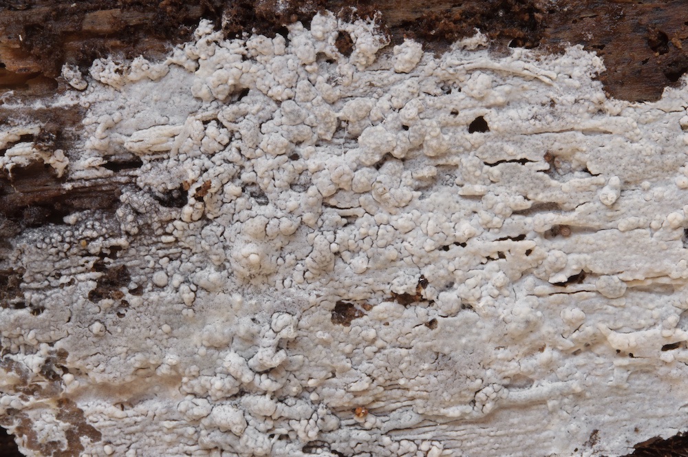 Byssoporia terrestris: Unterseite eines Abies-Stammstücks.