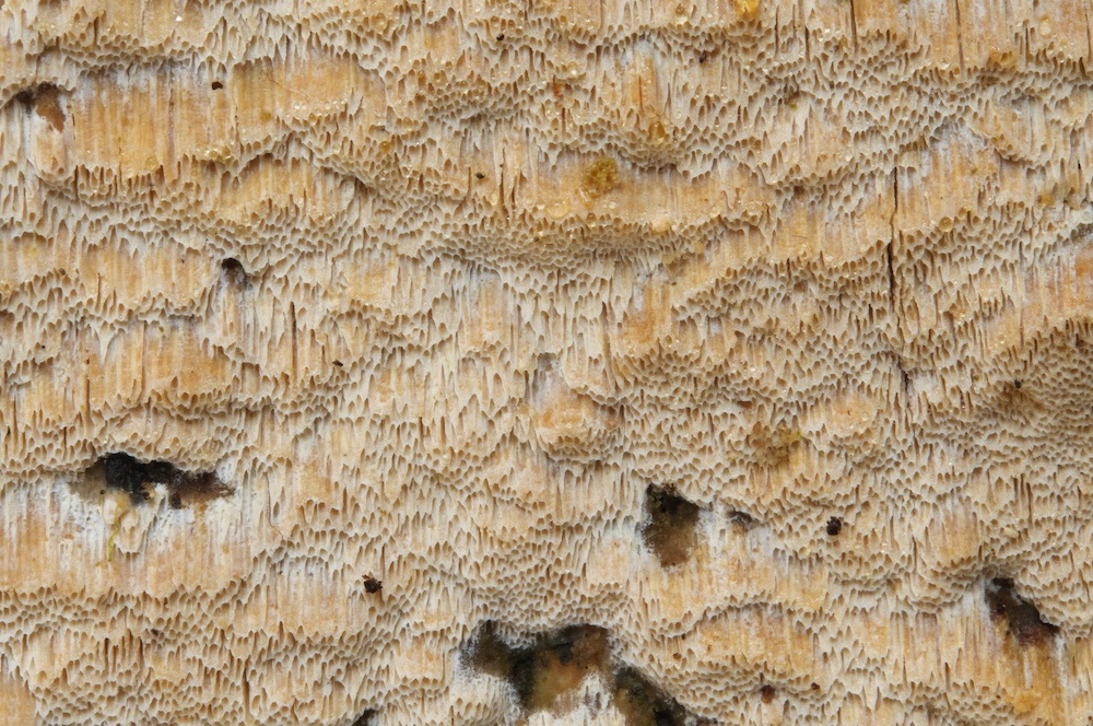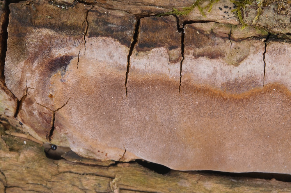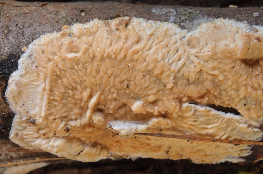 Hypochnicium geogenium: Unterseite eines liegenden Abies-Stammstücks.