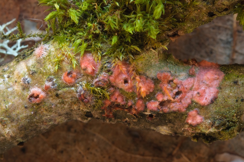 Marchandiomyces aurantioroseus: Quercus-Ast im Luftraum, mit alten Ascomata von Colpoma quercinum.