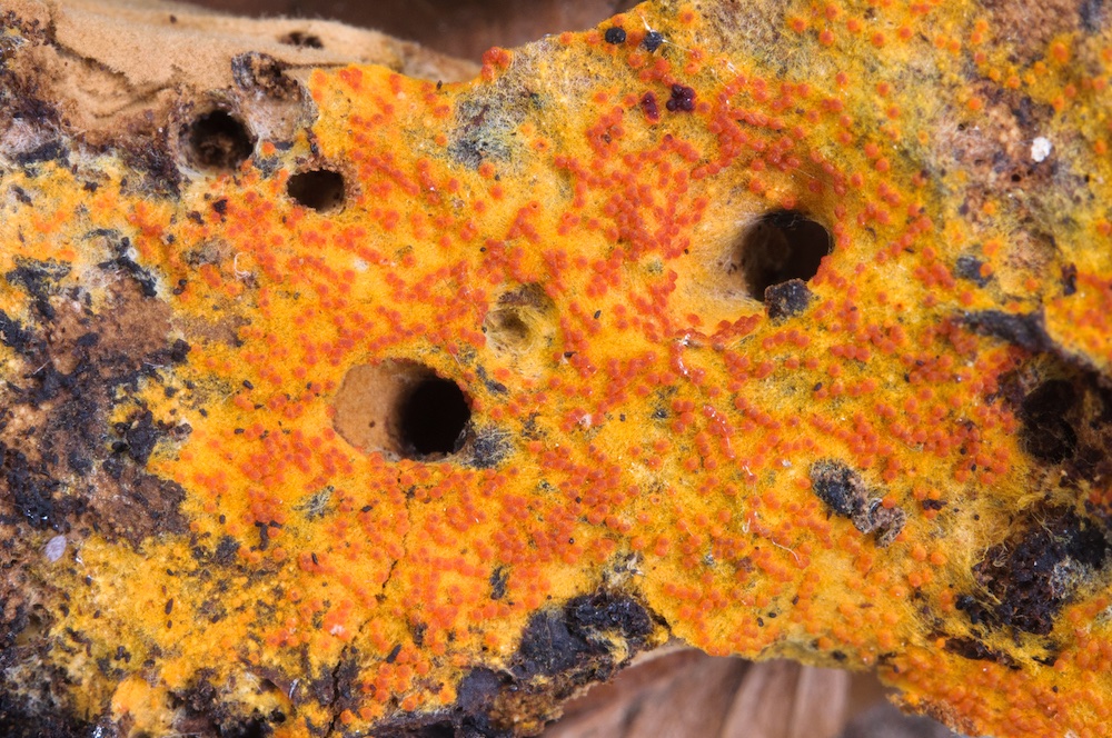 Hypomyces aurantius: Alter Porling auf Fagus, ziemlich sicher Ischnoderma resinosum.