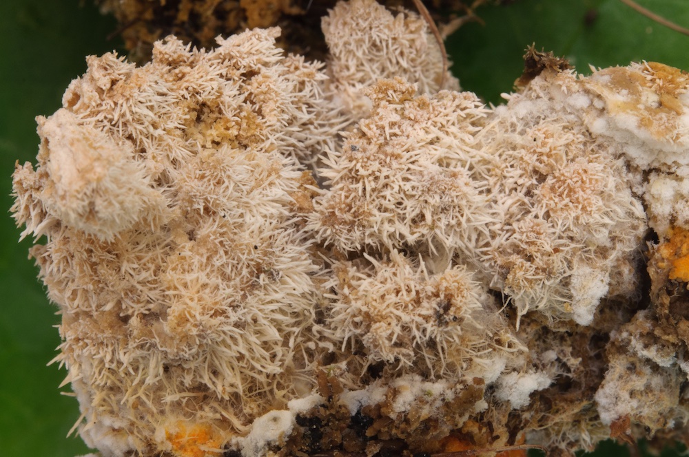 Tilachlidium brachiatum: Alte Pilzfruchtkörper auf einem Picea-Strunk.