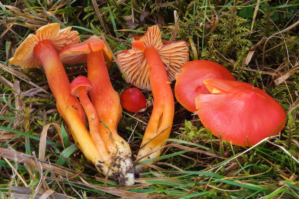 Hygrocybe coccinea, H. punicea und H. splendidissima (von links nach rechts) im direkten Vergleich.