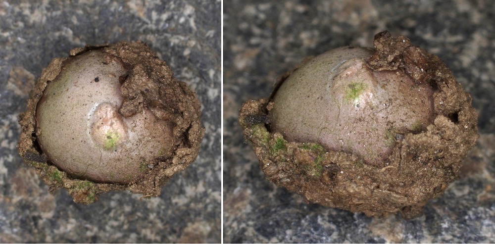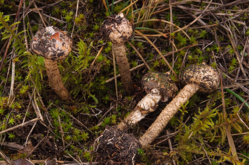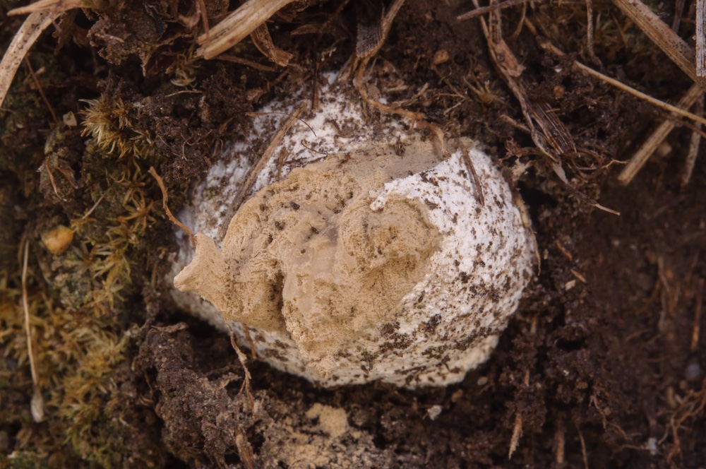 Tulostoma brumale: Kalktrockenrasen. Die zweite Kollektion war ungewöhnlich kräftig und mit einem schuppig aufbrechenden Stiel eher untypisch.